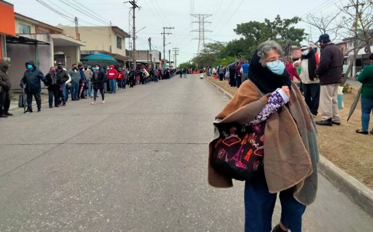 Algunos abuelitos tiemblan con los 9ºC de temperatura que se sienten está mañana en Tampico, sin embargo, permanecen en la fila para vacunarse contra el Covid-19 de Puertas Coloradas dónde la afluencia es baja.